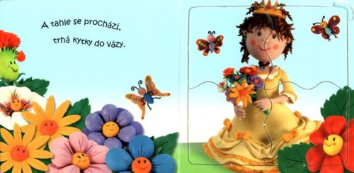 Knížka se čtyřmi říkankami o pohádkových princeznách. Na každé dvojstraně je kratičký rýmovaný text doplněný čtyřdílkovým puzzle, které je opatřeno otvorem pro snazší vyjmutí prvního dílku. Jasně barevné ilustrace určitě zaujmou malé čtenáře a především puzzle skládače.