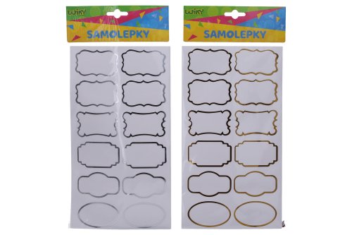 Nálepky o velikosti 14x25,5cm. Nálepky vhodné na kořenky, jmenovky. Rámečky ve 2 barevných provedení - zlaté a stříbrné.