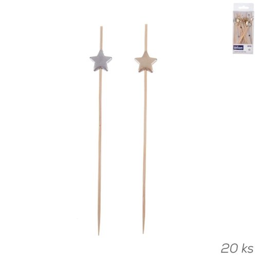 Bambusová napichovátka s barevnou ozdobou ve tvaru HVĚZDY. Vhodné při servírování drobného slaného nebo sladkého pohoštění při různých příležitostech, oslavách, na zimní párty, na vánoční setkání. Ozdobí jednohubky, muffiny, dortíky, olivy, kousky sýra. Sada 20 ks. Mix barev zlatá a stříbrná. Materiál bambus, javorové dřevo s barevným nástřikem (ozdoba). Délka 12 cm. EAN 8592381242336