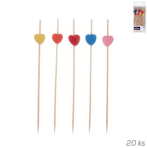 Bambusová napichovátka s barevnou ozdobou ve tvaru SRDÍČKA. Vhodné při servírování drobného slaného nebo sladkého pohoštění při různých příležitostech, oslavách, na párty, na valentýnskou oslavu... Ozdobí jednohubky, muffiny, dortíky, olivy, kousky sýra. Sada 20 ks. Mix barev. Materiál bambus, javorové dřevo s barevným nástřikem (ozdoba). Délka 12 cm. EAN 8592381242169