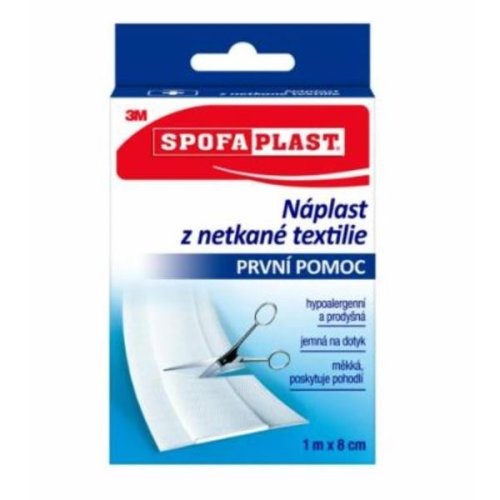 Čtěte pečlivě informace, které se vztahují k bezpečnému používání. 3M Spofaplast Náplast z netkané textil.864 1mx8cm je zdravotnickým prostředkem určeným pro překrytí a ochranu drobných poranění a odřenin.