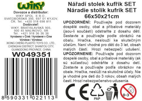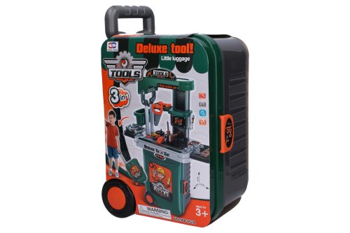Kutilský stolek set v kufříku – skvělá sada pro malé kutily. Kufřík na kolečkách s vysouvacím madlem. Výška kufříku s vysunutým madlem je 55,5 cm, se zasunutým madlem 38 cm. Kufřík lze snadno přestavět na kutilský stolek o rozměrech 66 x 50 x 21 cm. Návod na sestavení je vytištěn na obalu. Součástí balení je stolek, šroubky, ozubená kola, svěrák a další příslušenství. Rozměry balení: 24,2 x 37,7 x 17 cm. Věk: 3+