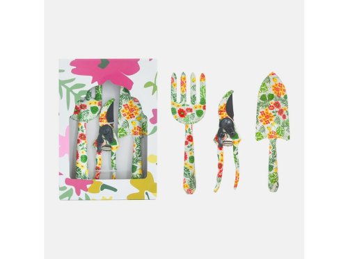 Stylové ruční nářadí s květinovým motivem, balené v krabičce. Vhodné i jako dárek. Obsahuje malé ruční nářadí pro přesazování rostlinek a nůžky pro zastřihnutí rostlin.