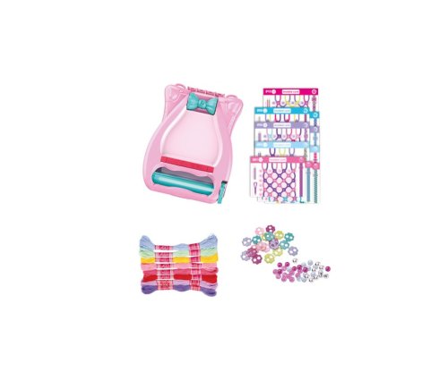 Náramky přátelství - hrací set - je tvořivá sada určená dětem od tří let, která umožňuje vyrábět originální náramky pomocí jednoduchých technik vázání. V balení najdete praktický růžový přístroj s mašličkou, který usnadňuje výrobu náramků a pomáhá udržet nitě napnuté během práce. Tento přístroj má ergonomický tvar a je vyroben z lehkého plastu, díky čemuž je manipulace pohodlná i pro malé ruce.