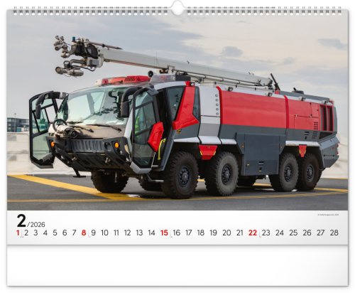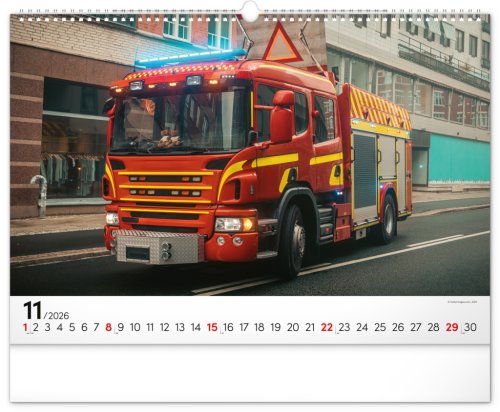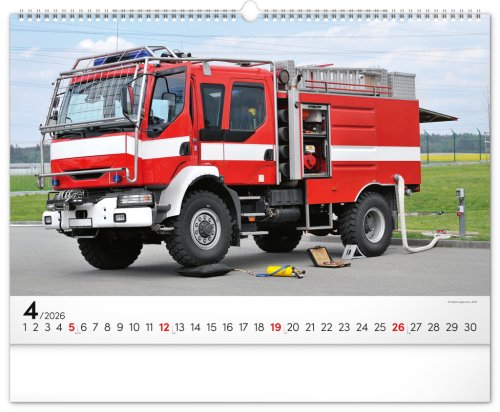 Nástěnný kalendář pro všechny příznivce hasičských vozů. Dvanáct snímků techniky hasičského záchranného sboru na stránkách kalendáře v šířkovém formátu. Fotografie jsou doplněny univerzálním kalendáriem na černém pozadí.