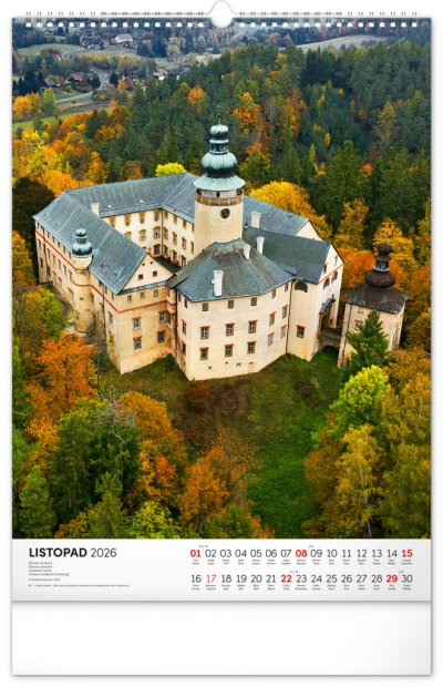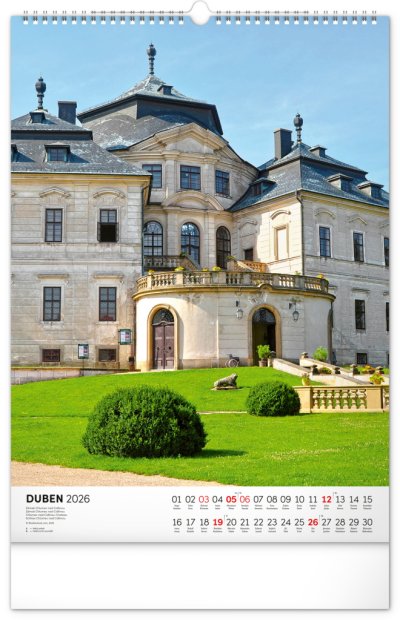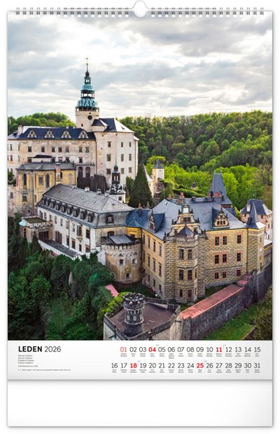 Barevné fotografie Lokte, Lednice, Hluboké či Bouzova na stránkách nástěnného kalendáře ve výškovém formátu. Jednoduché kalendárium s českými svátky a jmény.