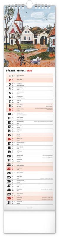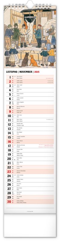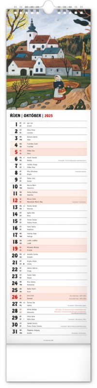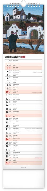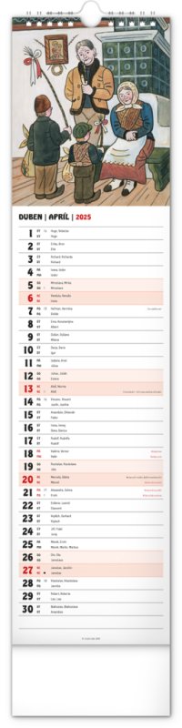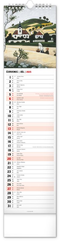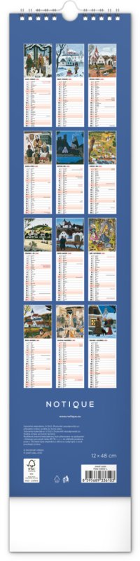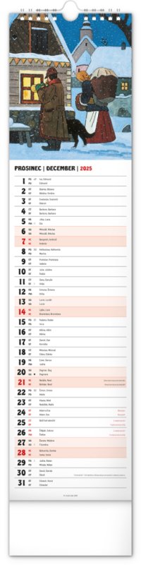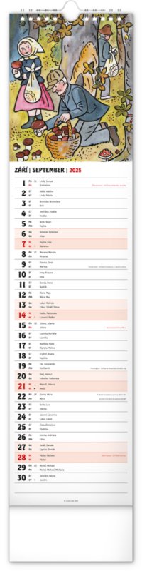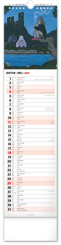 Nástěnný kalendář s ilustracemi Josefa Lady a jeho pohádkovými motivy je vyhotoven v oblíbeném úzkém formátu, který osvěží každý interiér. V kalendáři je rovnocenně zahrnuta čeština a slovenština, ilustrace doplňují česká a slovenská jména, svátky, památné dny a fáze měsíce. Každý den má prostor pro poznámky, víkendové dny jsou barevně odlišené od pracovních.
