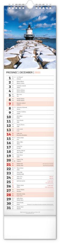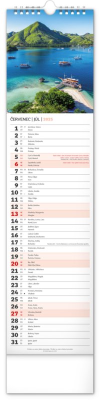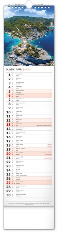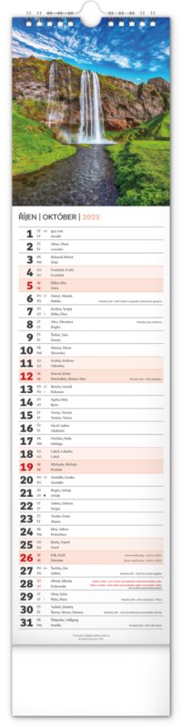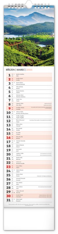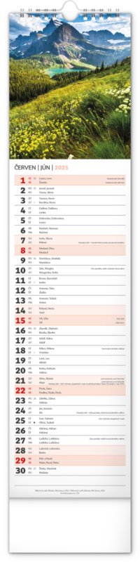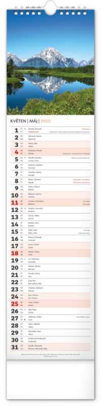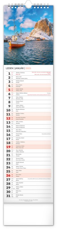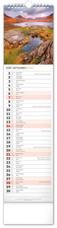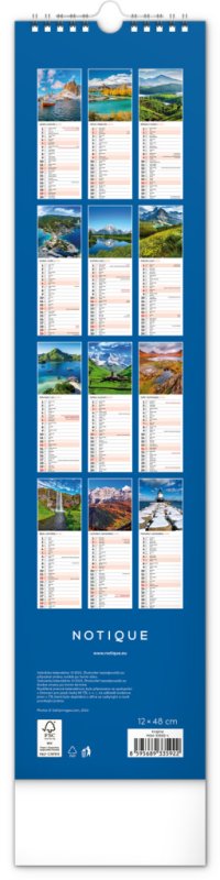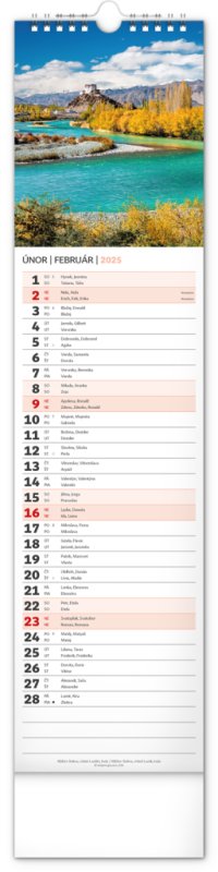 Udělejte si radost pohledem na fotografie malebné krajiny v praktickém úzkém formátu česko-slovenského nástěnného kalendáře. Kalendář obsahuje česká a slovenská jména, svátky, památné dny i fáze měsíce. V každém jednotlivém dni je prostor pro poznámky.