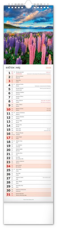 Udělejte si radost pohledem na fotografie malebné krajiny v praktickém úzkém formátu česko-slovenského nástěnného kalendáře. Kalendář obsahuje česká a slovenská jména, svátky, památné dny i měsíční fáze. V každém jednotlivém dni je prostor pro poznámky.