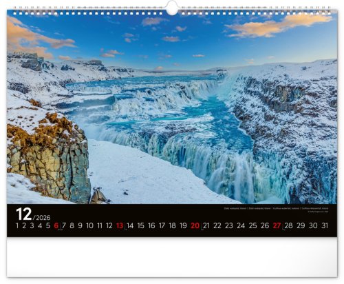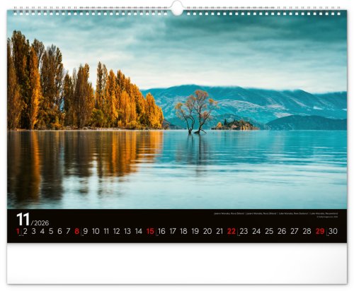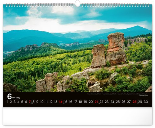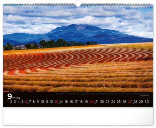 Fotografie dvanáct pestrobarevných přírodních výjevů z celého světa. Romantické záběry horských údolí i nížin, vodstev i pouští. Jednoduché kalendárium na černém pozadí.