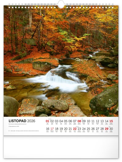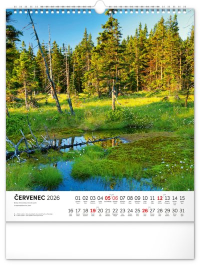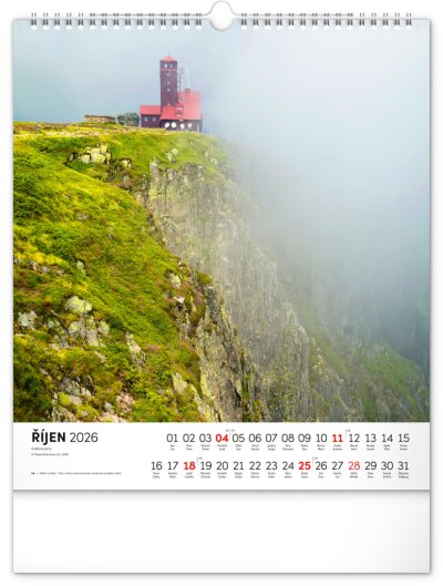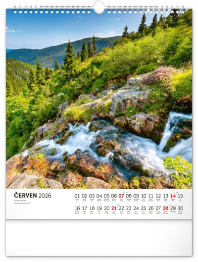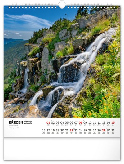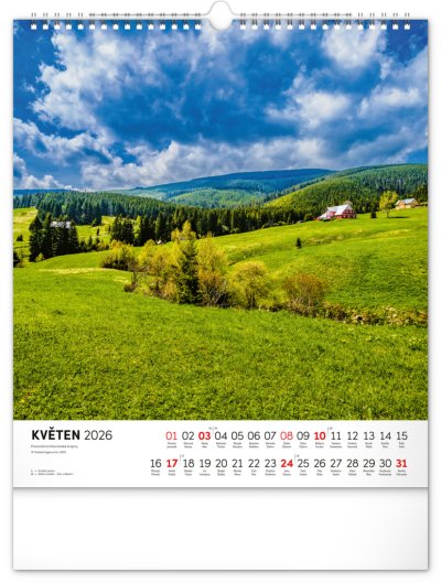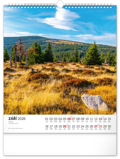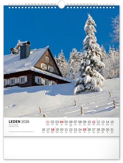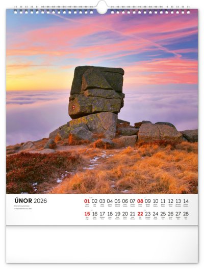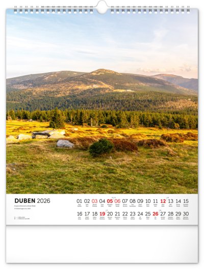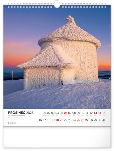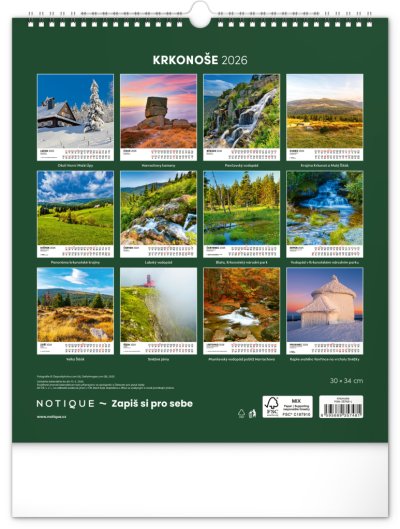 Dvanáct působivých snímků zachycujících krásu Krkonoš ve čtvercovém formátu. Fotografie jsou doplněny jednoduchým kalendáriem na bílém pozadí.