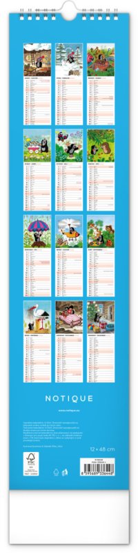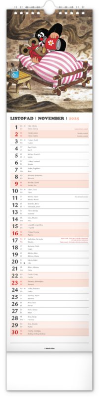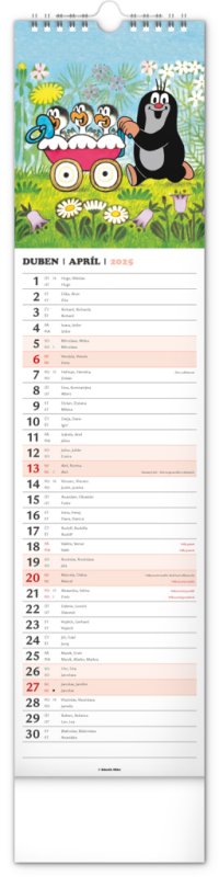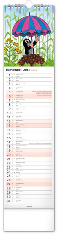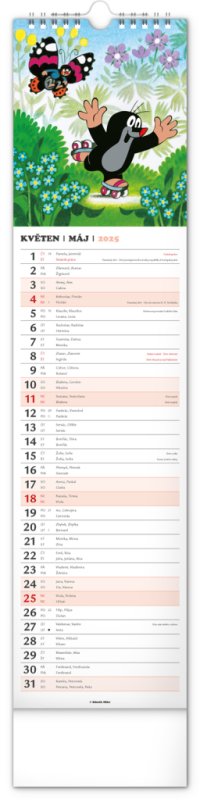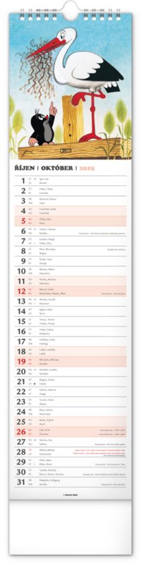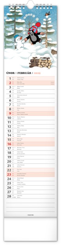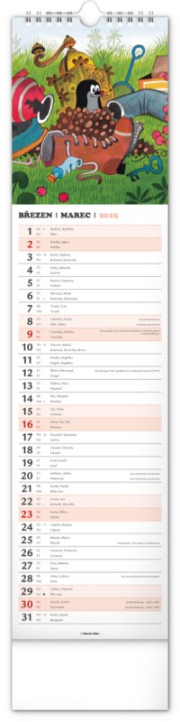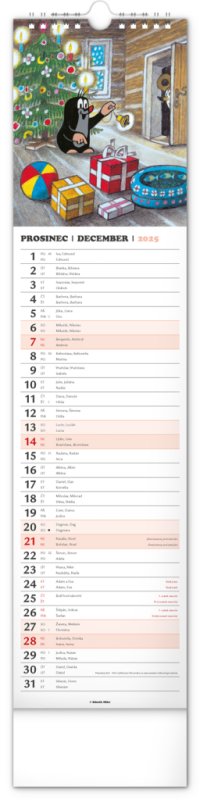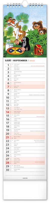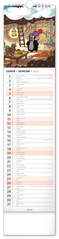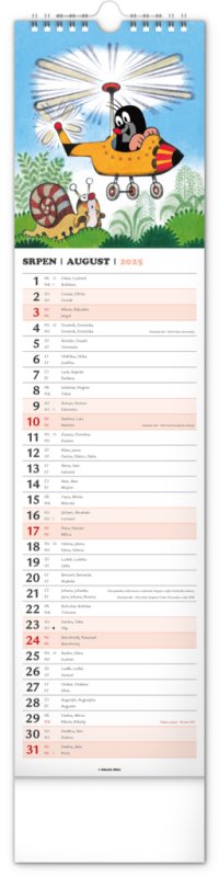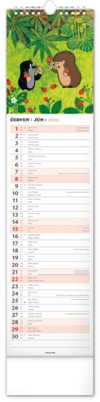 Praktický kravatový formát kalendáře s ilustracemi Zdeňka Milera. Ilustrace v kalendáři doplňuje české a slovenské kalendárium se jmény, svátky, památnými dny a fázemi měsíce. Každý den má prostor pro poznámky, víkendové dny jsou barevně odlišené od pracovních.