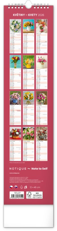 Okrasné květiny a květinová aranžmá na stránkách nástěnného kalendáře v praktickém kravatovém formátu, který se vejde opravdu všude. V česko-slovenském kalendáři je rovnocenně zahrnuta čeština a slovenština, česká a slovenská jména, svátky, památné dny i měsíční fáze. V každém dni je prostor pro poznámky.