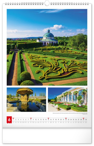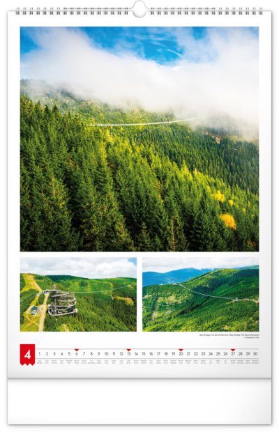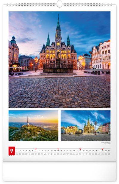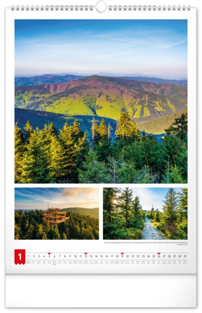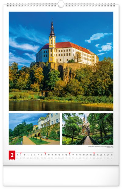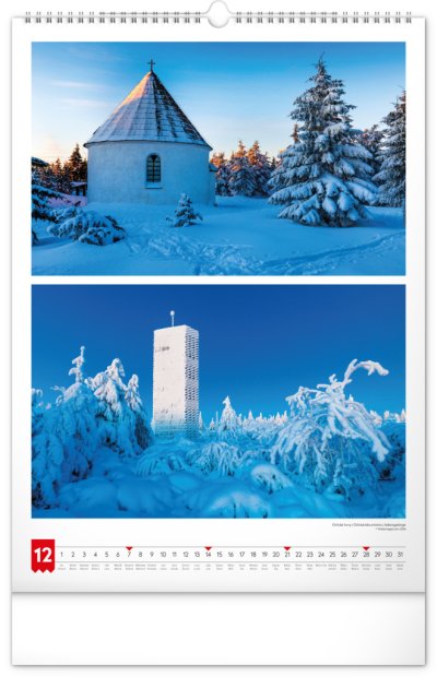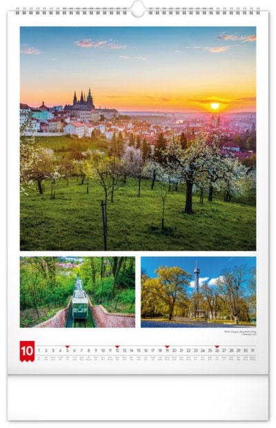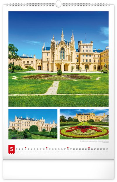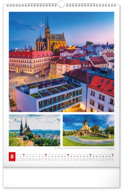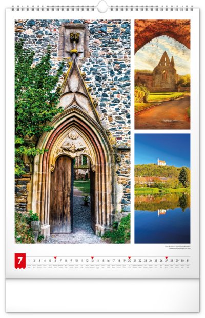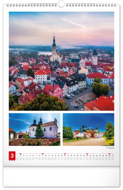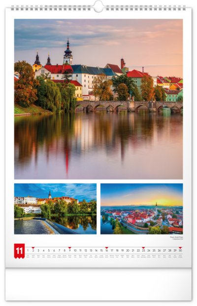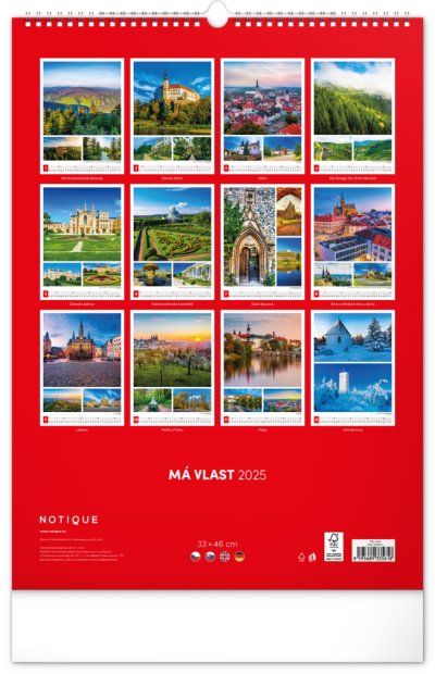 Kalendář s fotografiemi z nejkrásnějších míst České republiky. Praha, Kutná Hora, Olomouc a další skvosty v kalendáři s tématem Má vlast ve výškovém formátu 3+1 s popisky a jednoduchým kalendáriem.
