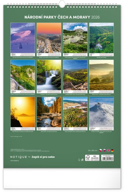 Objevujte krásu českých a moravských národních parků během celého roku. Nástěnný kalendář obsahuje dechberoucí fotografie přírody v oblíbeném výškovém formátu. U fotografií najdete popisky ve čtyřech jazycích a doplňuje je české kalendárium se jmény a svátky.