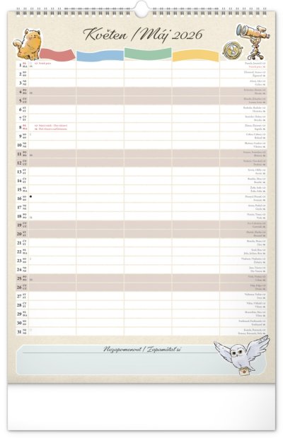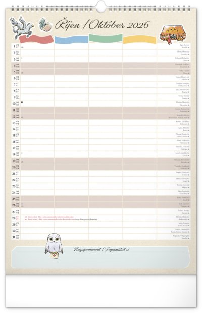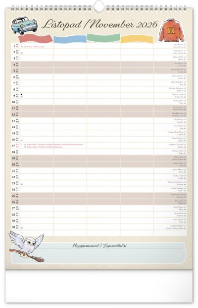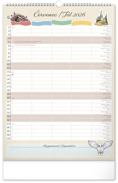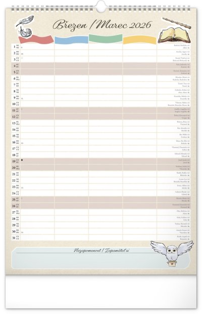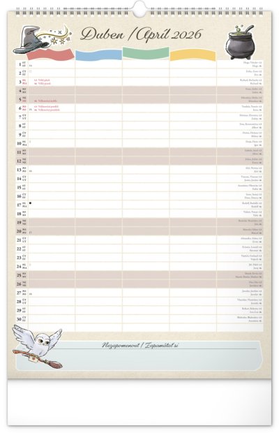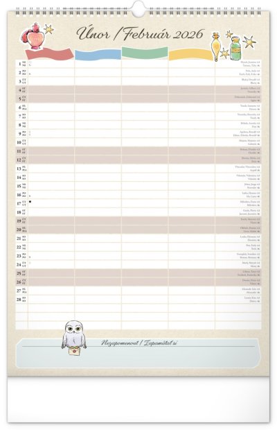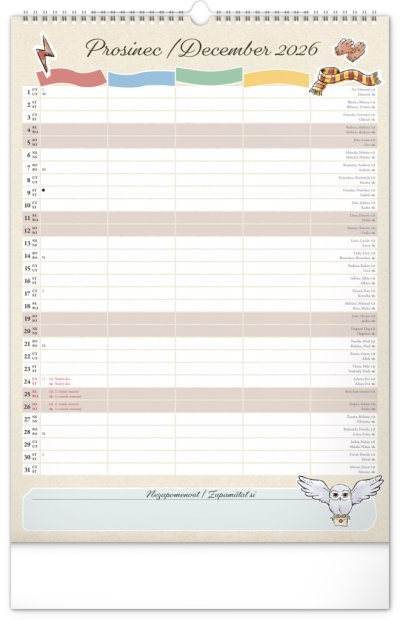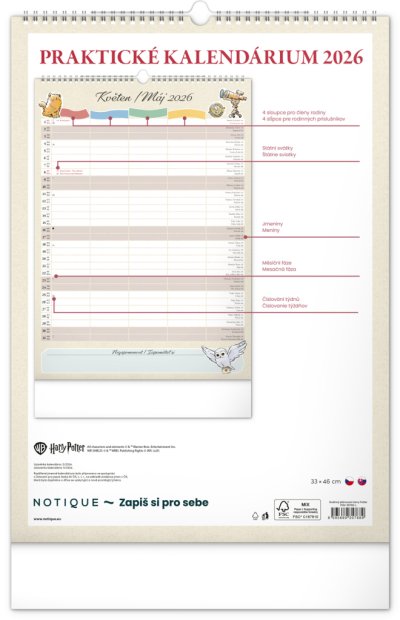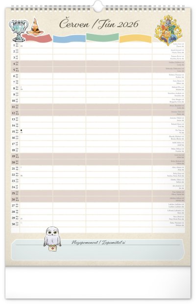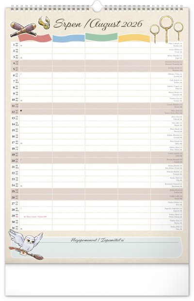 I v Bradavicích je třeba mít ve věcech pořádek! Plánujte rodinné aktivity s kalendářem, který každý měsíc přináší kouzelnou atmosféru světa Harryho Pottera. Kalendář má české a slovenské kalendárium a samostatný plánovač až pro čtyři členy domácnosti, nechybí státní svátky ani měsíční fáze. Perfektní pomocník pro mudly i čaroděje.