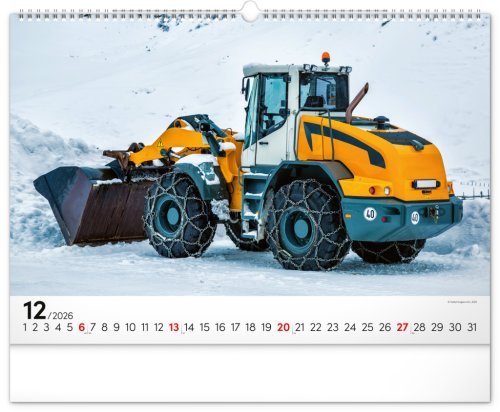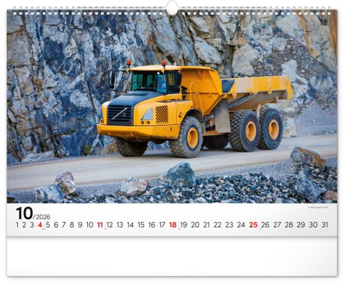 Nástěnný kalendář pro všechny milovníky velkých a těžkých stavebních strojů. Dvanáct snímků těžkotonážní stavební techniky na stránkách kalendáře v šířkovém formátu. Fotografie jsou doplněny univerzálním kalendáriem na černém pozadí.