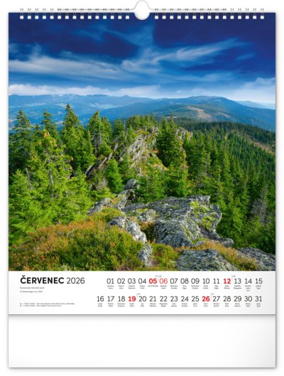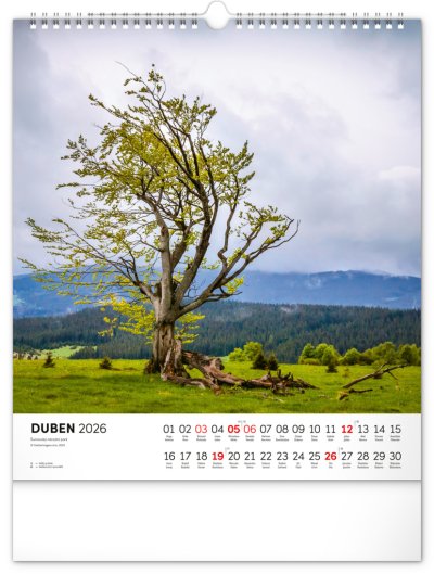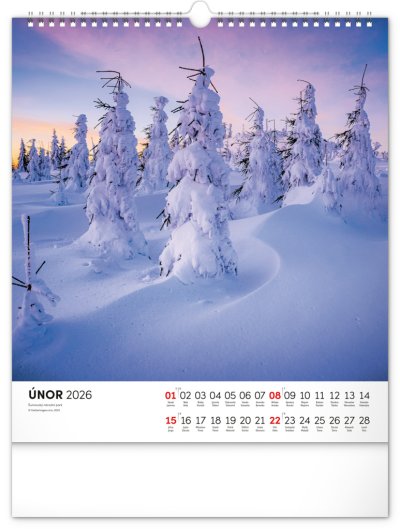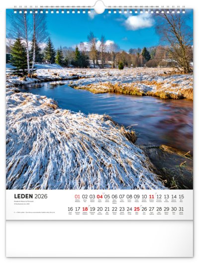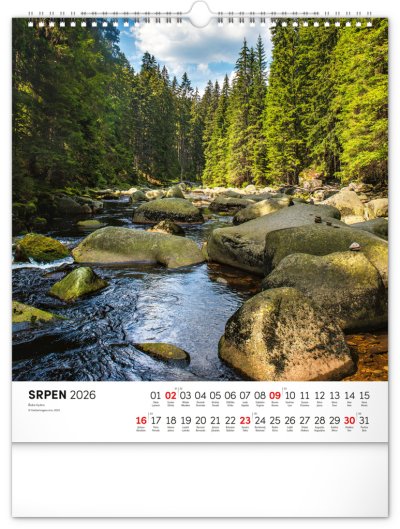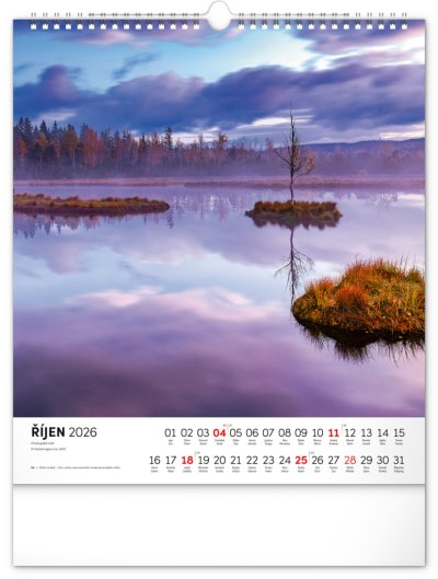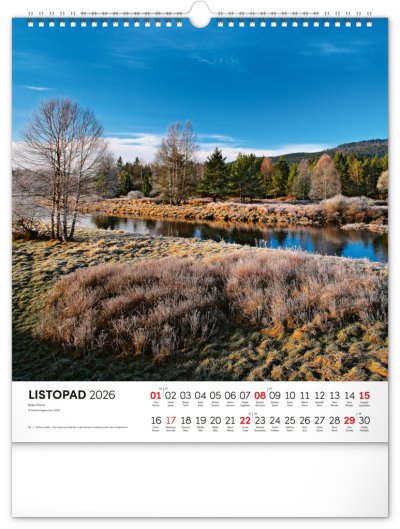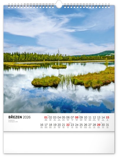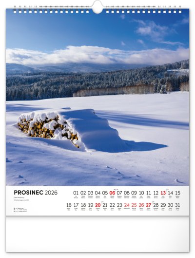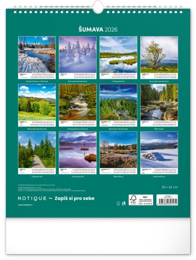 Dvanáct působivých snímků zachycujících krásu Šumavy ve čtvercovém formátu. Fotografie jsou doplněny jednoduchým kalendáriem na bílém pozadí.