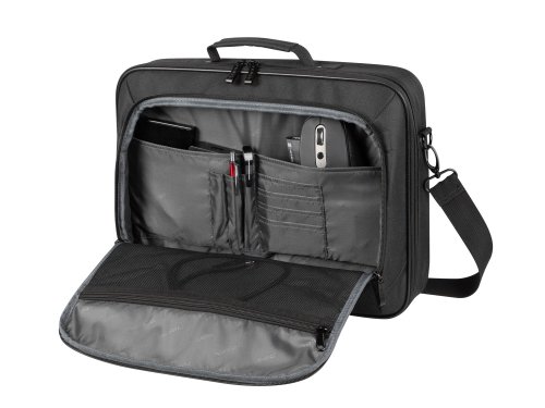 SPECIFIKACE: Typ: Brašna Specializace: Notebooky Maximální velikost: 15.6 " Přihrádky: 2 Kapsy: Mobilní telefon, Tablet, Notebook, Dokumenty, Příslušenství Kapsy: 4 Materiál: Polyester 600D Zámek: Zip Barva: Černá Konstrukce: Ramenní pás Ramenní popruh: Ano Rukojeť: Ano Maximální statické zatížení: 6 kg Délka: 410 mm Šířka: 65 mm Výška: 305 mm Hmotnost: 760 g