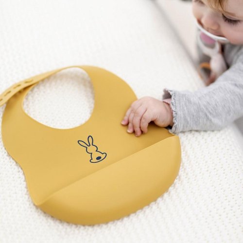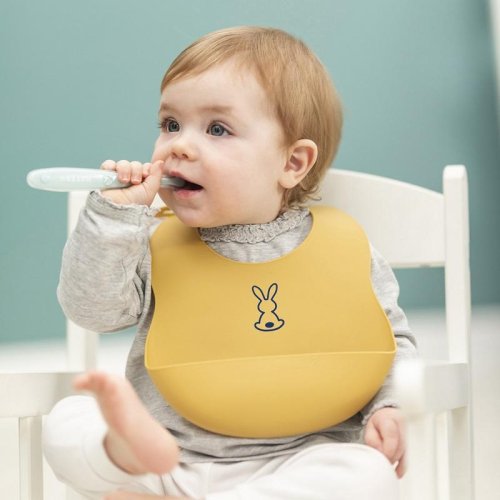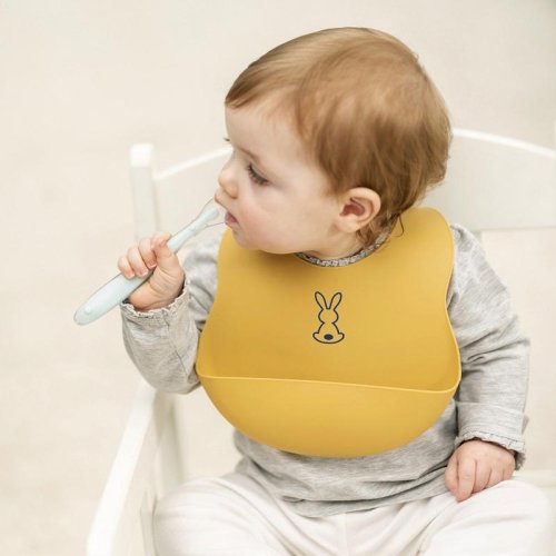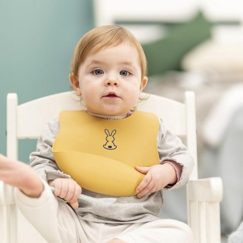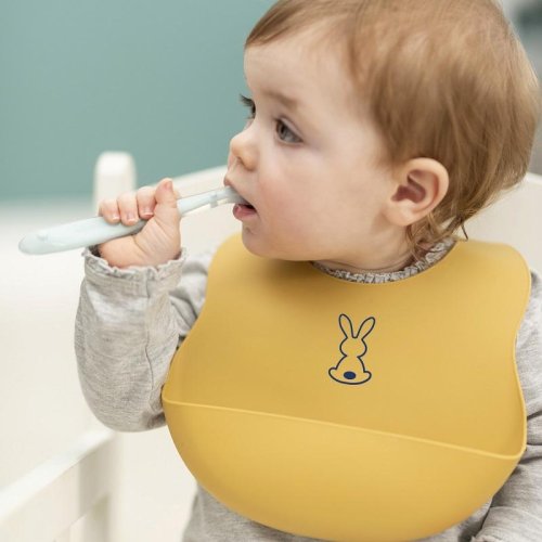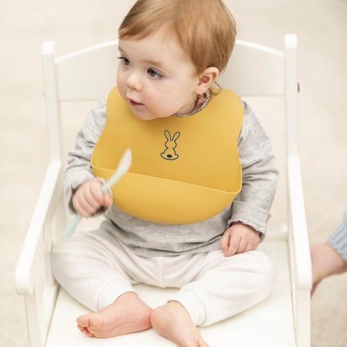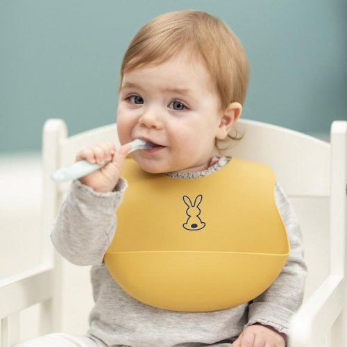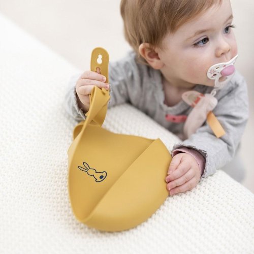 Bryndák Nattou vyrobený z pružného silikonu s motivem roztomilých králíků a praktickou sběrnou částí zajistí krmení a jedení vašeho děťátka bez zbytečného stresu z nepořádku.