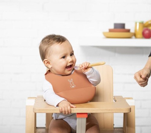 Bryndák Nattou vyrobený z pružného silikonu s motivem roztomilých králíků a praktickou sběrnou částí zajistí krmení a jedení vašeho děťátka bez zbytečného stresu z nepořádku.