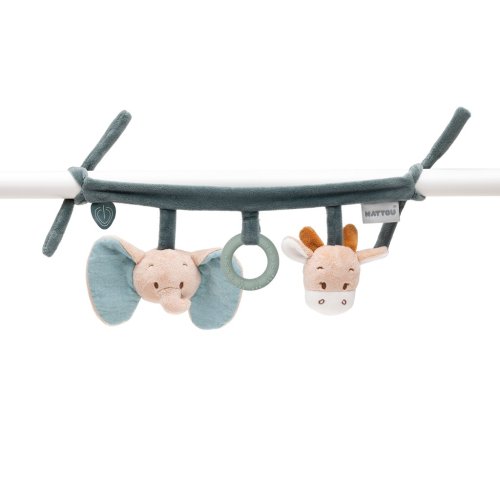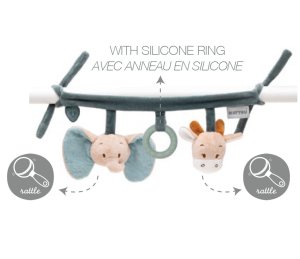 Vlastnosti: -obsahuje silikonovou kousátko a dvě chrastítka ve tvaru hlavy sloníku a žirafy -možnost připojit k postýlce, kočárku, dětské sedačce, ohrádce -rozvoj hrubé a jemné motoriky díky různým tvarům a materiálům -sluchová stimulace pomocí chrastění a šustění