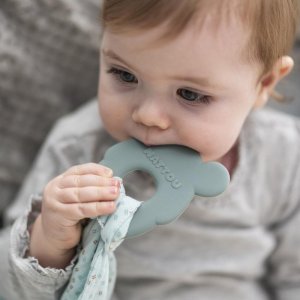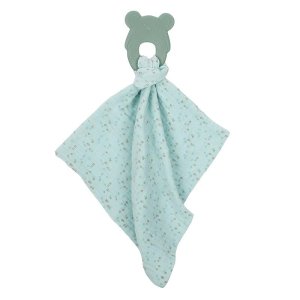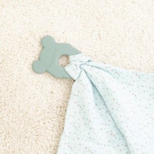 Dečka je z extra měkké látky ze 100% bavlny, která má otvor na snadné připevnění a vyjmutí kousátka. Kousátko má texturovaný povrch na masáž a zklidnění dásní během kousání ..