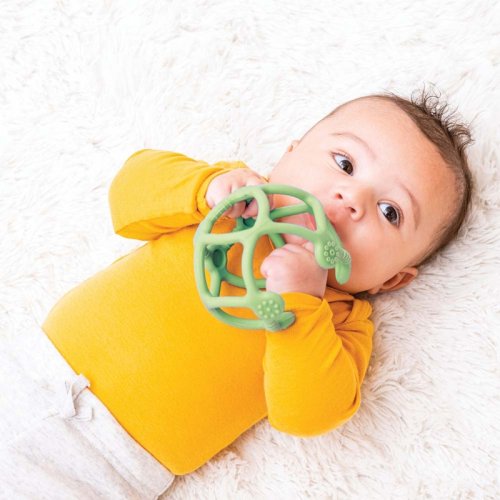 Silikonová kousátko v podobě dvou kuliček v poutavých barvách, které se dají snadno uchopit.