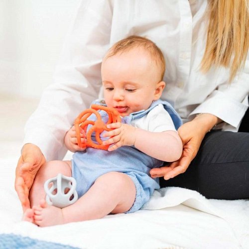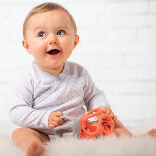 Silikonová kousátko v podobě dvou kuliček v poutavých barvách, které se dají snadno uchopit.