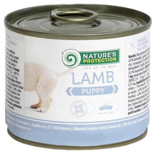 Kompletní krmivo pro štěňata s jehněčím. Složení: Jehněčí (67%), vývar, rýže (3%), minerální látky, klinoptilolit sedimentárního původu (1g568) 0,1%, lněný olej 0,1%. Doplňkové látky: Nutriční doplňkové látky/1kg: vitamín D3 (E671) 200 m.j., E6 (Zn) 15 mg, E5 (Mn) 3 mg, E2 (I) 0,75 mg. Analytické složky: Vlhkost 75 %, protein 10,4 %, hrubé oleje a tuky 6,9 %, hrubý popel 2,4 %, hrubá vláknina 0,4 %. Dávkování: