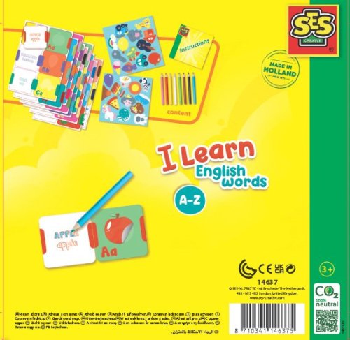 Chcete se naučit nějaká nová anglická slovíčka? Právě to můžete udělat s touto krásnou, ilustrovanou sadou I learn! Přiřaďte barevné nálepky ke správným prvním písmenům a poté najděte správné kartičky se slovy. Umístěte karty ve správném pořadí. Pokud jste uvedli správné slovo, barevné testovací oblasti se budou shodovat. Vybarvováním slov se aktivně učíte hláskovat slova a krok za krokem se učíte více a více anglických slov. Obsahuje: 52 karet s písmeny a anglickými slovy, 8 pastelek. Věk: 3+