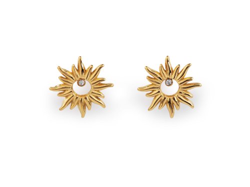 Decentní náušnice z nerezové oceli zdobí motiv slunce, které je uvnitř ozdobené třpytivým broušeným kamínkem. Náušnice mají vysoký zrcadlový lesk. Puzeta je s kovovou zarážkou proti vypadnutí.