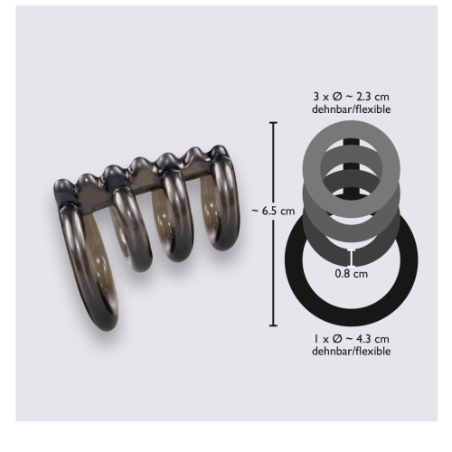 Pružný a velmi flexibilní návlek na penis v krásném kouřovém provedení. Návlek je tvořen 4 kroužky o různém průměru. Kroužky drží pohromadě díky hřebínku, který bude příjemně dráždit i vaši partnerku. Celý návlek je vyrobený z odolného pružného materiálu, který neobsahuje ftaláty ani jiné škodlivé látky. Po použití stačí omýt pod tekoucí vodou.