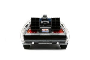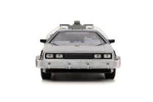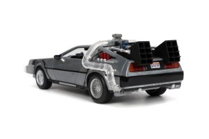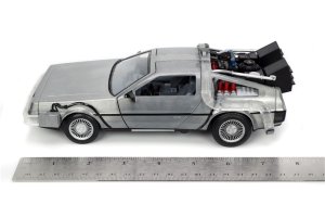 Kovový model Stroje času z filmu Návrat do budoucnosti 1 (Back to the Future 1) v měřítku 1:24 na volnoběh. Otevírací dveře, světlo. Velikost 23 cm.