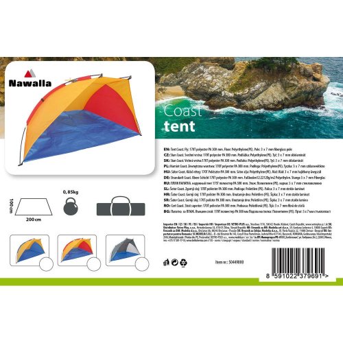 Plážový přístřešek COAST o rozměrech 200 x 100 x 105 cm s jednoduchou konstrukcí a nízkou váhou vás vždy bezpečně ochrání před chladným větrem nebo rozpáleným sluncem. Materiál 170T polyester potahovaný. Tyče průměr 7 mm.
