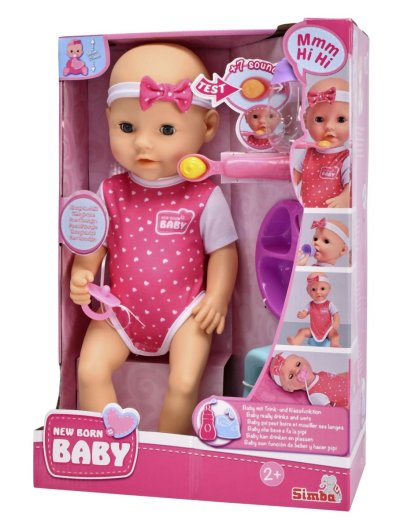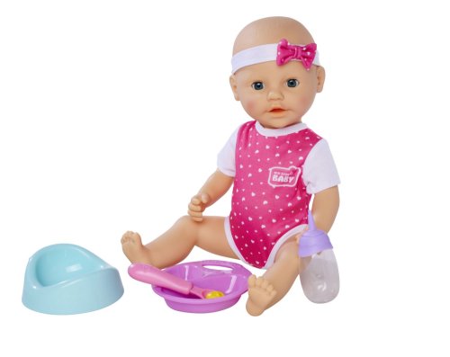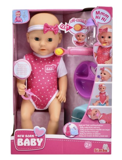 Panenka New Born Baby Hungry pije a čůrá a vydává zvuky. Balení obsahuje lahvičku, misku, kouzelnou lžičku a nočník. Výška panenky 38 cm.