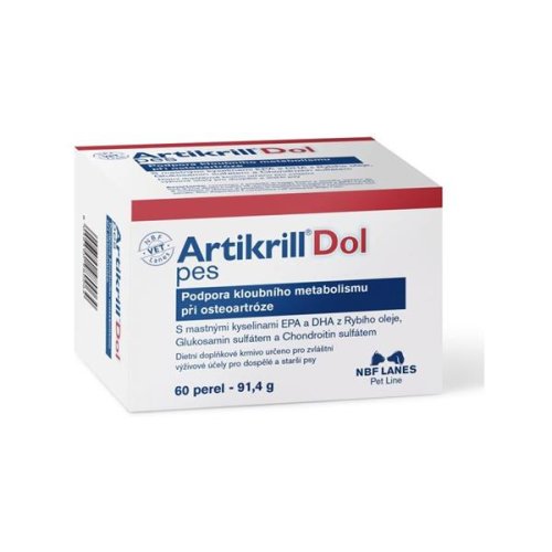 NBF Lanes Artikrill Dol je doplňkové krmivo ve formě kapslí určené pro dospělé a starší psy s osteoartrózou. Je 100% přírodní, podporuje kloubní metabolismus, tlumí bolest a záněty a chrání kloubní chrupavku. Obsahuje nenasycené mastné kyseliny z rybího oleje (EPA a DHA), glukosamin sulfát a chondroitin sulfát. Je vhodné jako součást nutraceutické léčby zejména v počáteční fázi osteoartrózy, kdy přispívá ke zlepšení pohyblivosti a kvality života psa. Složení: rybí olej (35 % EPA – 25 % DHA) 20,9 %, želatina (hovězí), glukosamin (chitosamin) z fermentace 17,4 %, chondroitin sulfát 11,5 %, glycerol, krilový olej 2,4 %, extrakty z bylin (prášek z listů Verbascum thapsus – divizny malokvěté) 1,6 %, vedlejší produkty včelařství (včelí vosk). Doplňkové látky: Nutriční přídavné látky: 3a700 vitamin E 49 342 mg/kg. Senzorické přídavné látky: botanicky definované přírodní produkty: výtažek z vrby bílé (Salix alba L.) 32 894 mg/kg, 2b163 výtažek z kurkumy (Curcuma longa L.) 19 736 mg/kg. Aromatické látky: směs aromatických látek. Technologické přísady: 1c322i lecitiny, E551b koloidní křemičitan. Dávkování: