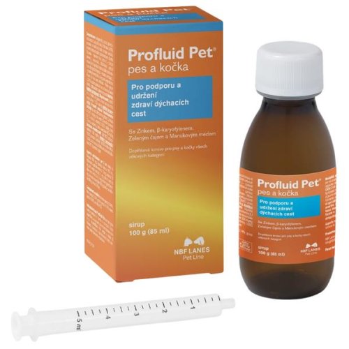 NBF Lanes Profluid Pet je přírodní doplňkové krmivo ve formě chutného sirupu pro psy a kočky, který podporuje zdraví dýchacích cest, zkapalňuje hlen, chrání sliznice a zklidňuje kašel. Obsahuje zinek, β-karyofylen, zelený čaj a manukový med. Složení: glukózový sirup, glycerol, vedlejší produkty včelařství (manukový med 4,16 %), hydrolyzované živočišné bílkoviny (drůbežího původu), produkty získané zpracováním bylin (opuncie mexická – Opuntia ficus indica L. – prášek z plochých stonků), sacharóza, MSM–methylsulfonylmethan 0,4 %, produkty získané zpracováním rostlin (ananas – Ananas comosus L. – prášek ze stonku) 0,4 %, rostlinné oleje a tuky (rafinovaný olej z černého rybízu – Ribes nigrum L.) 0,1 %, arabinogalaktan z modřínové kůry 0,04 %, vedlejší produkty včelařství (propolis). Doplňkové látky: Nutriční přísady: 3b607 chelát glycinu a zinku, hydratovaný (pevná forma) 416,6 mg/kg (zinek 112,5 mg/kg). Organoleptické přísady: botanicky definované přírodní produkty: lékořice (Glycyrrhiza glabra L.) 41 666,6 mg/kg, zelený čaj (Camellia sinensis (L.) O. Kuntze) extrakt 2 083,3 mg/kg, tymián (Thymus vulgaris L.) éterický olej 400 mg/kg. Aromatické látky: 2b01007 beta-karyofylen 208 mg/kg. Technologické přísady: 1k202 sorban draselný, 1a330 kyselina citronová, 1a263 octan vápenatý, E466 karboxymethylcelulóza, E412 guarová guma. Dávkování: