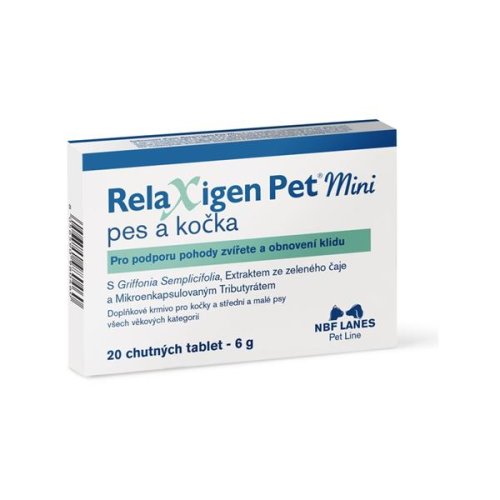 NBF Lanes Relaxigen Pet Mini je přírodní doplňkové krmivo ve formě chutných tablet, vhodné pro psy malých a středních plemen a kočky všech věkových kategorií, pro podporu zvládání stresových situací (stěhování, cestování, osamělost, hluk apod.). Působí prostřednictvím osy střevo–mozek díky kombinaci tyndalizovaných bakterií, prebiotik (FOS) a mikrokapsulovaného tributyrátu ke snížení chronického stresu u zvířete. Tablety jsou snadno dělitelné, což usnadňuje podávání. Složení: fosforečnan vápenatý, soli mastných kyselin (CLA – kyselina konjugovaná linolová) 10 %, moučka z mořského zooplanktonu (kril), inaktivované bakterie a jejich části (Limosilactobacillus reuteri NBF1), hydrolyzovaný živočišný protein (kuřecí játra), extrakty z bylin (prášek ze semen Griffonia simplicifolia) 4 %, inaktivované kvasinky (pivovarské kvasnice), FOS (fruktooligosacharidy), rostlinné oleje a tuky (hydrogenovaný palmový olej), cukry, hořečnatá sůl kyseliny citronové (citrát hořečnatý), hořečnatá sůl kyseliny stearové, oxid hořečnatý, kukuřičný škrob, maltodextrin. Doplňkové látky: Nutriční přísady: 3a700 vitamín E (rac-alfa-tokoferyl acetát) 12 500 mg/kg. Sloučeniny stopových prvků: 3b802 seleničitan sodný 18,25 mg/kg (selen 8,34 mg/kg). Organoleptické přísady: botanicky definované přírodní produkty: extrakt ze zeleného čaje (Camellia sinensis (L.) O. Kuntze) 40 000 mg/kg. Aromatizující látky: 2b09211 glyceryl-tributyrát 12 000 mg/kg, směs aromatizujících látek. Technologické přísady: E460 mikrokrystalická celulóza, E551b koloidní oxid křemičitý, E464 hydroxypropylmethylcelulóza, 1b306 (i) tokoferoly extrahované z rostlinných olejů. Dávkování:
