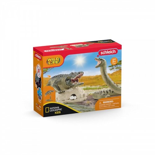 Opatrně! Pokud se vydáváš na průzkum bažin Schleich® WILD LIFE musíš si dávat opravdu dobrý pozor, kam šlapeš. Jinak si nejen ušpiníš ponožky, ale možná tě do prstu kousne had nebo aligátor. Obvykle jsou docela klidní, ale když spí příliš dlouho, mají spoustu přebytečné energie, což znamená, že potřebují vypustit páru. A právě tehdy se had snaží ukrást vejce z hnízda a sníst je za syrova. Ale aligátor má vejce raději smažená! Kdo podle tebe vyhraje? A co kdybys vajíčka vzal třeba ty a běžel s nimi do kuchyně? Rozměry: 19 x 15 x 6 cm. Věk: 3+