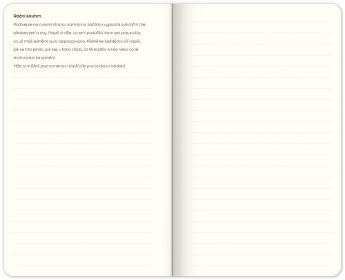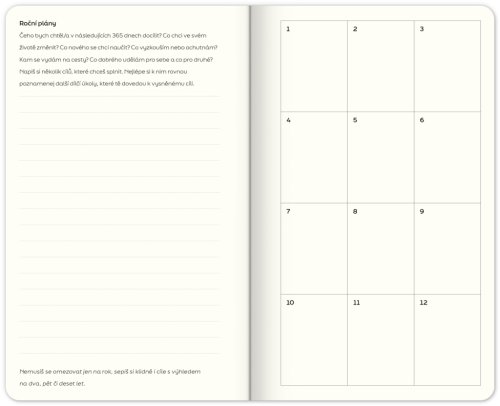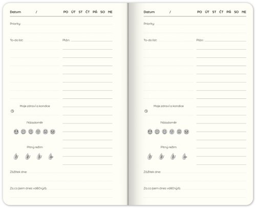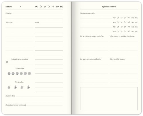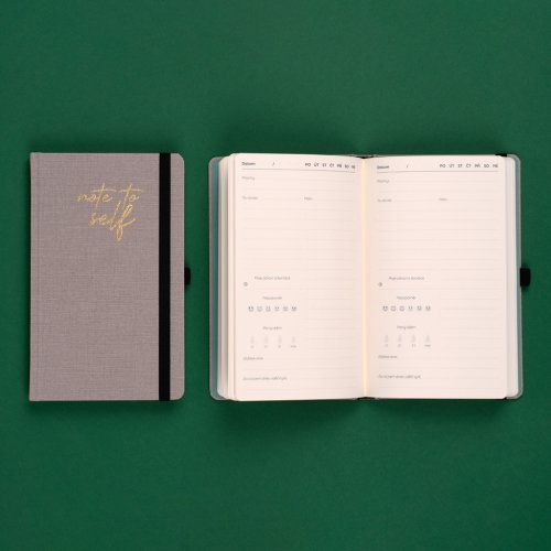 Posuňte svoje plánování ještě o úroveň výš s diářem Note to self. Pokud nad deníkem strávíte 5 minut denně, např. při pití ranní kávy, budete šťastnější, uvolněnější a výkonnější. Zpomalte a zamyslete se nad organizací vašich aktivit. K tomu vám pomůže týdenní rozvržení a místo pro sledování návyků, sebereflexi a pokroky v osobních cílech. S nedatovaným diářem můžete začít kdykoliv chcete.