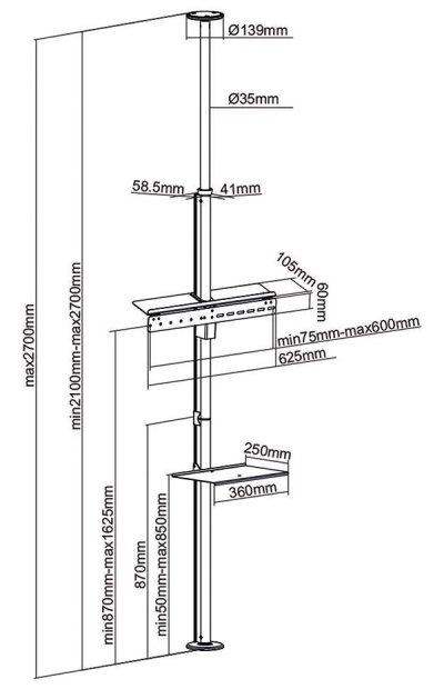 Stojan pro montáž televize s úhlopříčkou 37 až 70" určený k upevnění mezi podlahu a strop. Díky teleskopické tyči je možné jej umístit do místrnosti o výšce 210 až 270 cm. Konstrukce stojanu umožňuje snadné nastavení výšky od 87 do 162,5 centrimetrů a otáčení v rozsahu 180°. Zajisté potěší také police pro AV komponenty nebo vestavěný systém správy kabeláže. Maximální hmotnost televizoru je 30 kg, nosnost police pro příslušenství činí 5 kg.