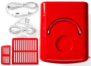 Mini chladnička, napájecí kabel 220–240 V s VDE zástrčkou, napájecí kabel 12 V s cigaretovou zástrčkou, uživatelská příručka.