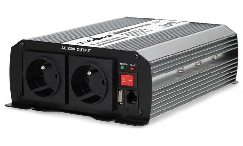 Měnič napětí s výkonem 1000 W a modifikovanou sinusoidou je ideální řešení pro napájení nejrůznějších elektrických spotřebičů určených pro síťové napájení, jako například notebooků, chladicích boxů apod. Vstupní napětí měniče je 12 V DC, výstupní napětí 230 V AC a účinnost 85 %. Takto můžete v nákladních automobilech, lodích či obytných vozech používat domácí spotřebiče, aniž byste museli investovat do speciálního vybavení pracujícího s napětím 12 V. Není vhodný pro napájení elektroniky citlivé na tvar vstupního napětí. Měnič je vybaven dvěma napájecími zásuvkami se zemnicím kolíkem (typ E) a jedním USB portem s výstupním napětím 5 V DC. Samozřejmostí je ochrana proti přehřátí, přetížení, zkratu, přepólování (pojistka), podpětí a přepětí. Součástí balení jsou kabely s očky pro připojení k baterii.