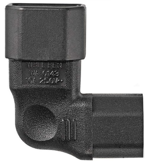Úhlový napájecí adaptér z IEC-320-C13 na IEC-320-C14 v levém úhlu. S tímto adaptérem můžete napájecí kabel připojit k zařízením, která mají méně prostoru pro konektory na zadní straně.