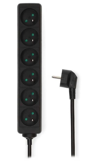 Tato prodlužovací zásuvka je vhodná k rozdělení zásuvky do šesti napájecích bodů. Je vybavena 1,5 m dlouhým kabelem k napájení elektrických zařízení kdekoli doma nebo v kanceláři. Díky kontaktnímu úhlu 45° je tato napájecí lišta vhodná i pro úhlové zástrčky.