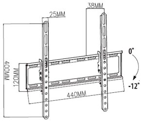 Robustní ocelový držák umožňuje bezpečné upevnění televizoru na stěnu s možností naklápění o 12° pro dosažení optimálního úhlu sledování. Díky minimální vzdálenosti 38 mm od stěny poskytuje kompaktní řešení pro úsporu prostoru.