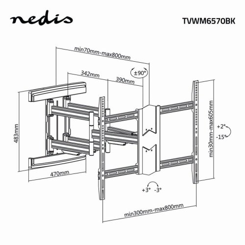Sklopný a otočný nástěnný držák pro ploché obrazovky s úhlopříčkou od 43" do 100" a hmotností až 70 kg. Možnost náklonu o +2° až -15° a otáčení až 180° umožňuje nastavit požadovaný úhel pohledu pro maximální flexibilitu při sledování obrazovky. Vestavěný systém správy kabeláže minimalizuje nepořádek. Držák má snadno nastavitelnou vzdálenost od zdi v rozsahu 7 až 80 cm a je vhodný pro obrazovky, které odpovídají standardům VESA 300 × 200 až 800 × 600 mm.