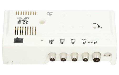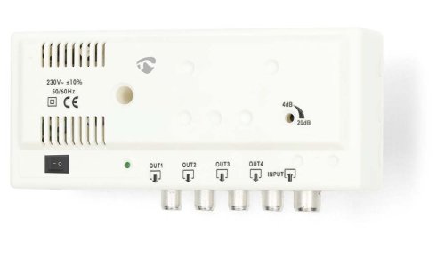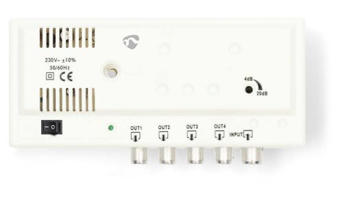 Profesionální čtyřcestný anténní zesilovač pro aktivní distribuci TV a rádiového signálu s 20dB zesílením.