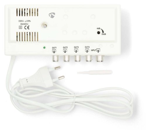 Zesilovač umožňuje připojení až čtyř přijímačů (TV/rádio) k jedné anténě s aktivní distribucí signálu v pásmu 47–694 MHz. Díky integrované regulaci zisku 0–18 dB můžete přesně přizpůsobit vstupní úroveň zesilovače výstupní úrovni zdroje pro optimální kvalitu signálu.